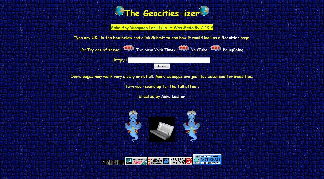 Nostalgia di quell’era? Grazie a “The Geocities-izer” potete “far apparire qualsiasi pagina come se fosse stata realizzata da un tredicenne nel 1996”: rende piuttosto bene l’idea (attenti al volume!)
