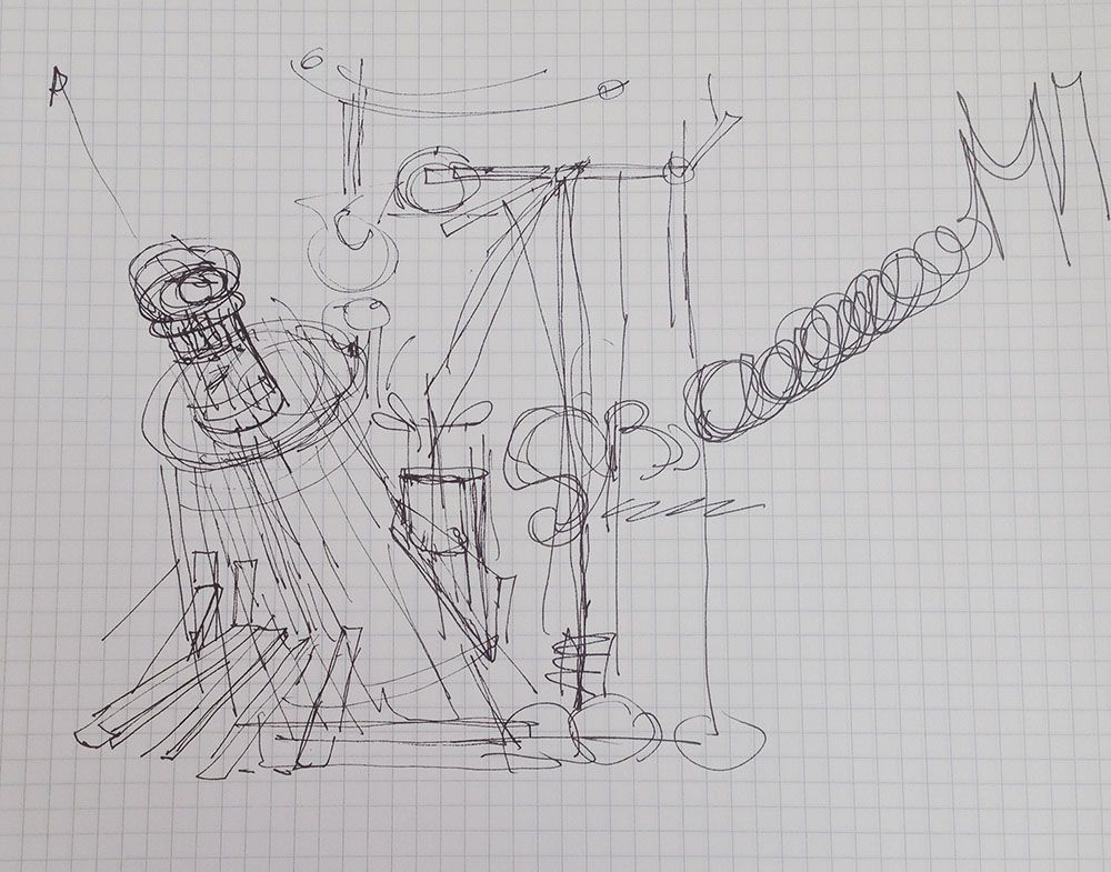 Bozzetto preparatorio di macchina sparaoggetti situata all’interno dell’Opificio dei Sogni di Annevar
