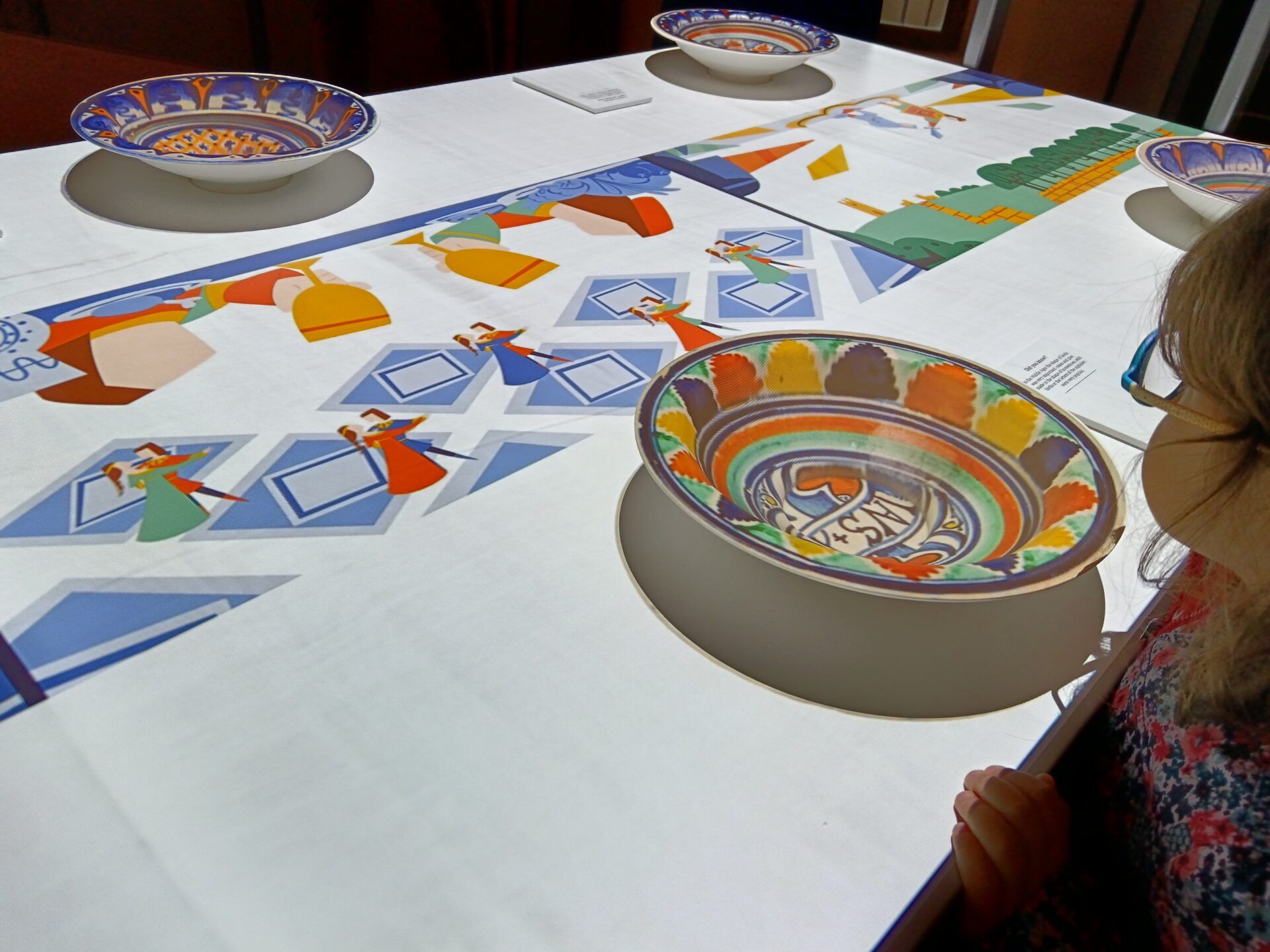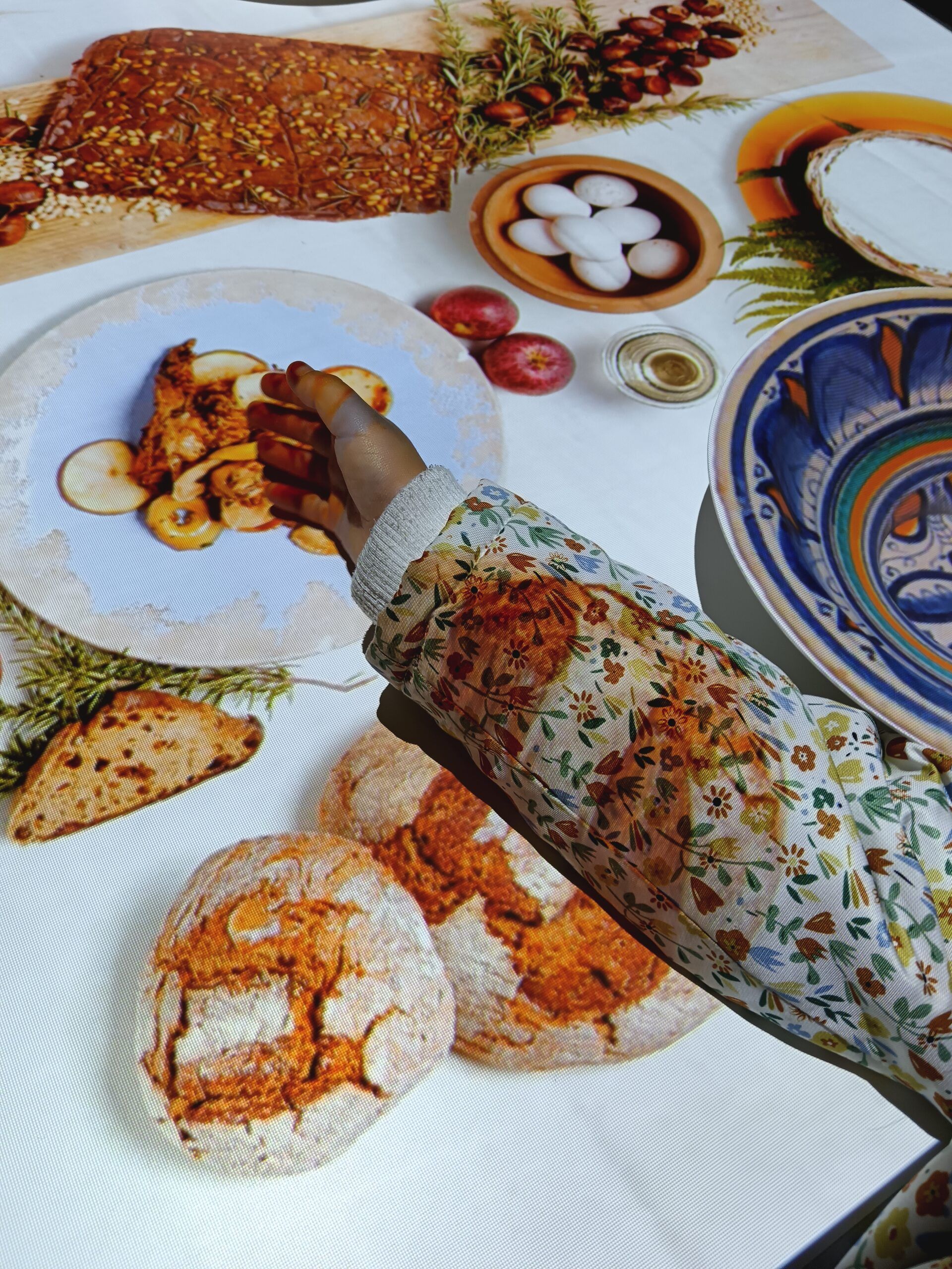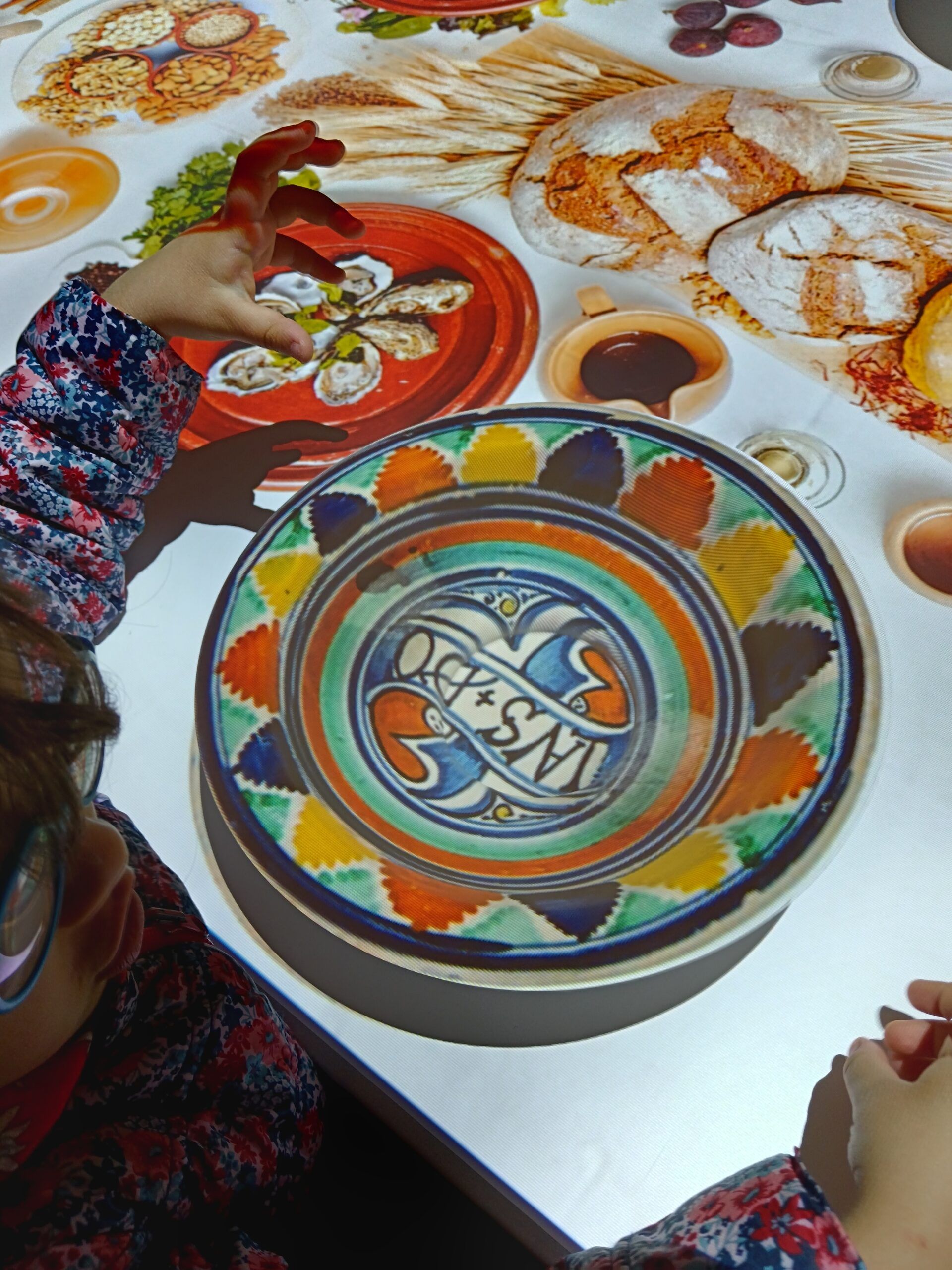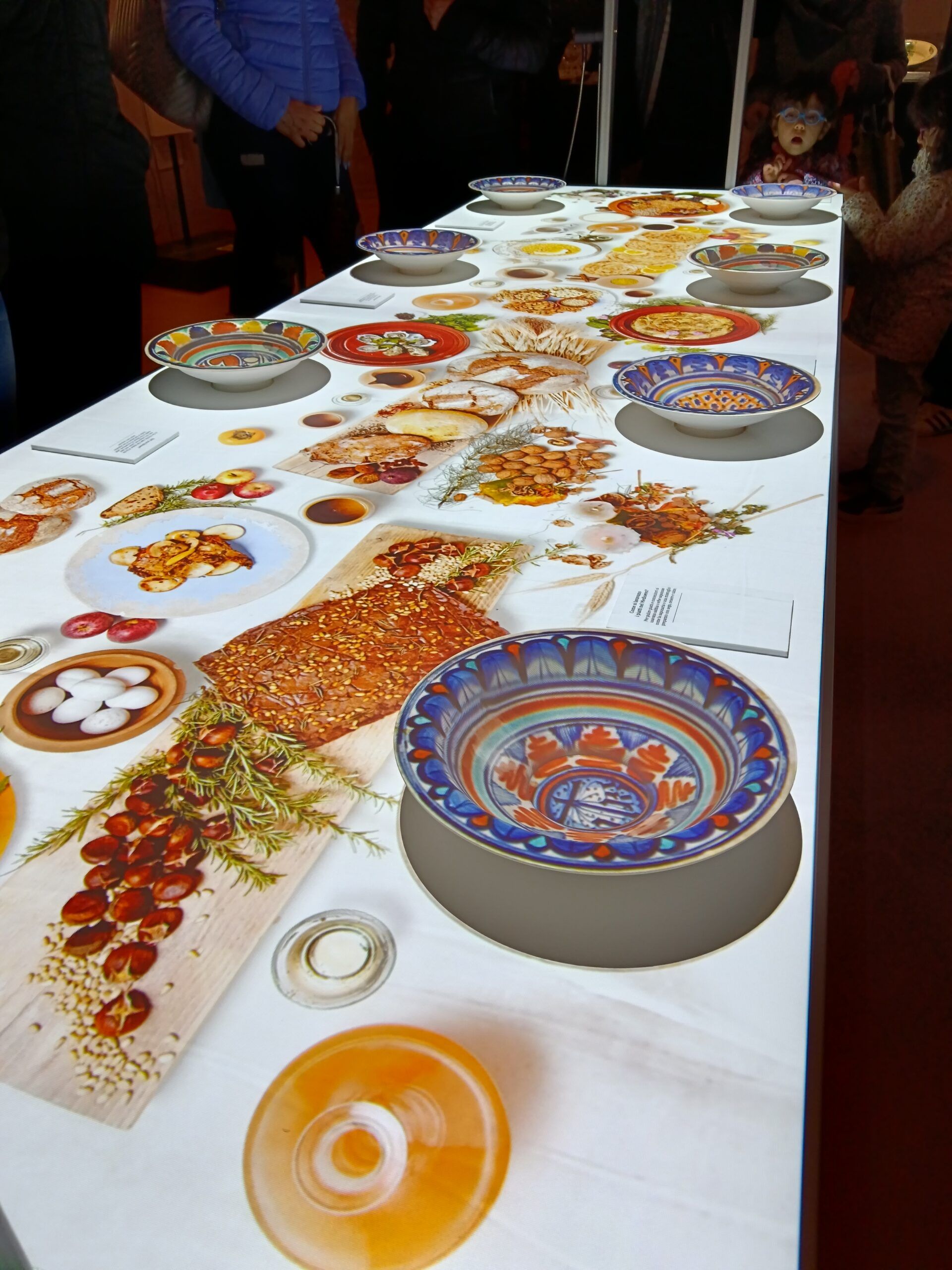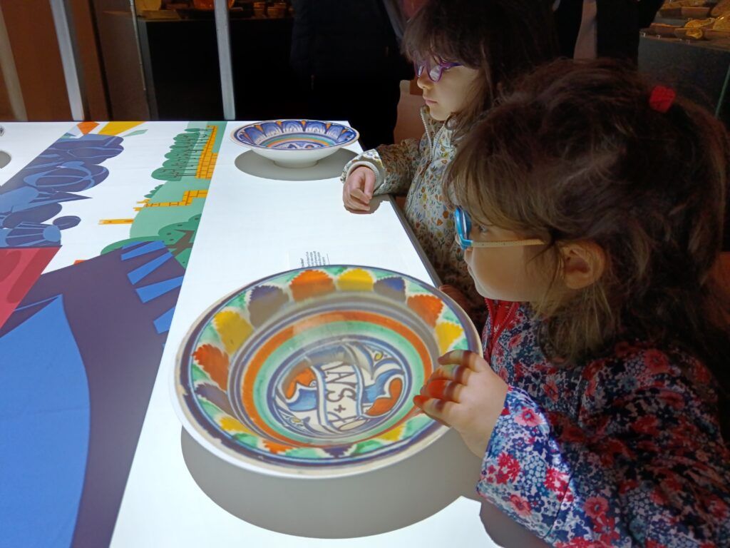 La video animazione invita il visitatore a prendere parte al banchetto e a posizionare i piatti realizzati in 3D e muniti di sensori nei rispettivi posti a tavola. Su ognuno dei piatti viene proiettata una diversa decorazione che i visitatori possono ritrovare anche nelle ceramiche esposte nelle teche della sala, mentre sulla tovaglia virtuale compaiono cibi e pietanze di un sontuoso banchetto medievale. La postazione è corredata di piccole targhe che contengono curiosità legate al cibo e alle usanze dell’epoca, tradotte in inglese e in braille.