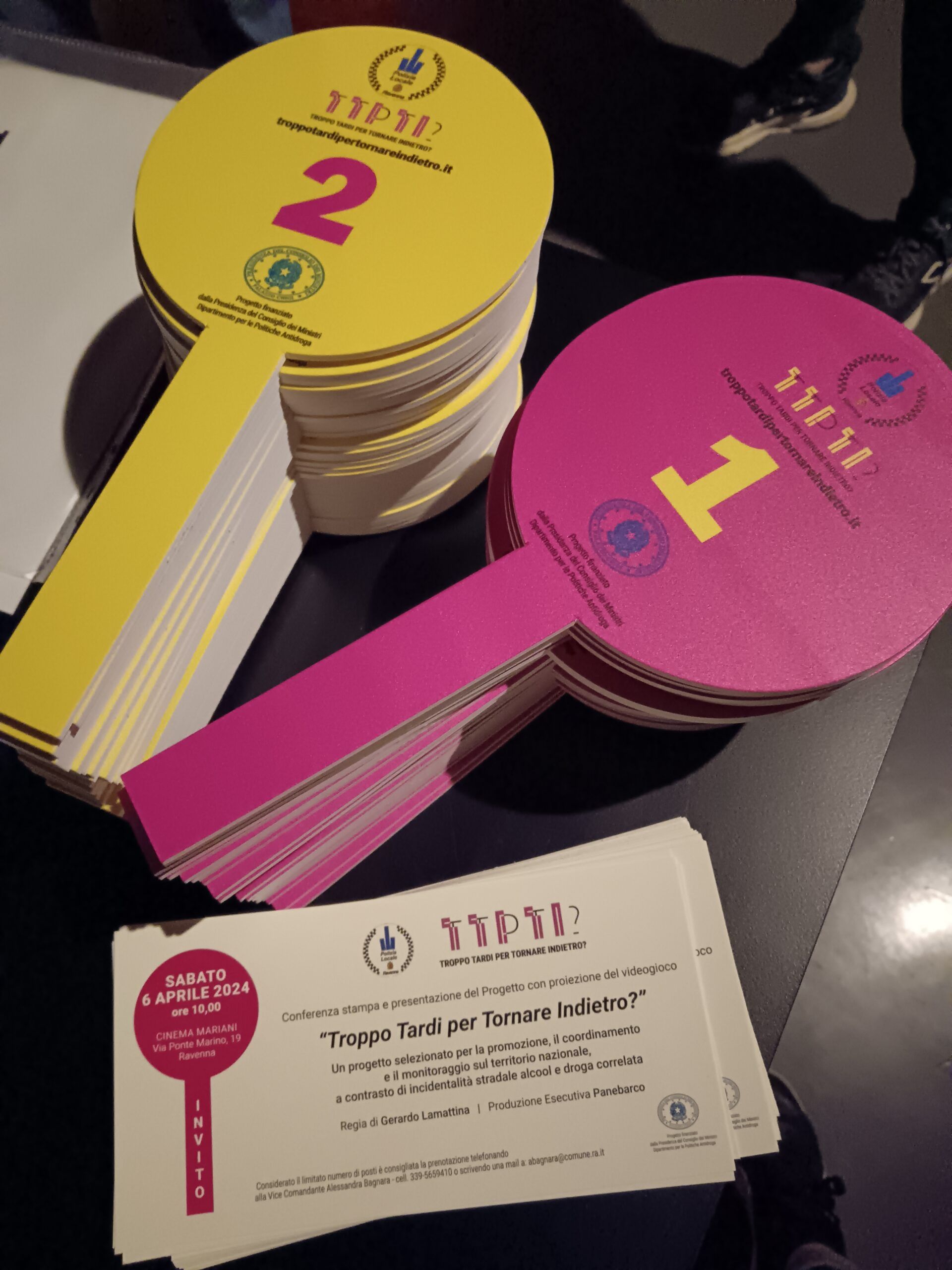 Sabato 6 aprile, alle ore 10:00, presso il Cinema Mariani di Ravenna, è stato svelato in anteprima nazionale alla stampa il progetto interattivo Troppo tardi per tornare indietro? (TTPTI?) www. troppotardipertornareindietro.it un’iniziativa innovativa della Polizia Locale di Ravenna diretta da Gerardo Lamattina e che ha visto la collaborazione di noi Panebarco per la produzione esecutiva, in collaborazione con MediaLabStore.